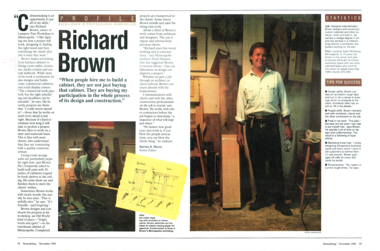 The Lamprey Pass Workshop has been the studio name for Richard Brown since 1978. Over a career as an artist/artisan, Richard has dedicated himself to making things properly. As the preview of work demonstrates, a diversity of projects have crossed the threshold at Lamprey Pass, from small designed furniture commissions to large commercial cabinet and millwork projects.